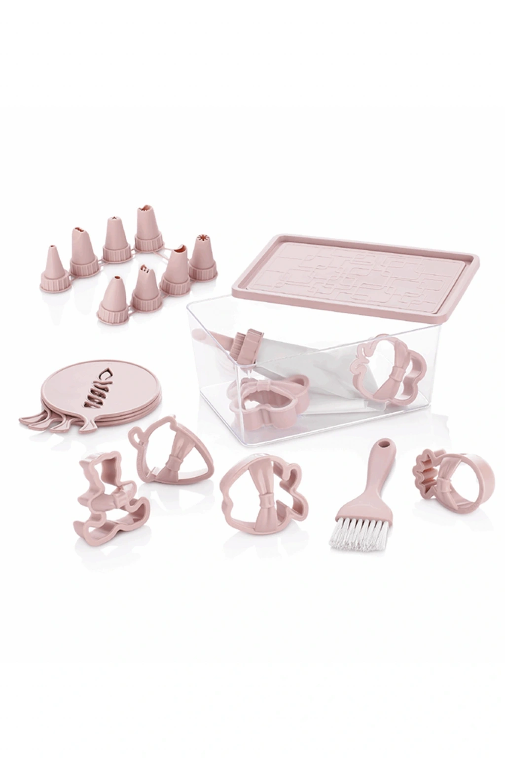 | 22 Parça Pasta Seti Pasta Seti (22 Parça) kutu İçeriği : Krema Torbası Şekilli Kapaklar Kurabiye Kalıpları Süsleme Şablonları Yumurta Fırçası Saklama Kabı |