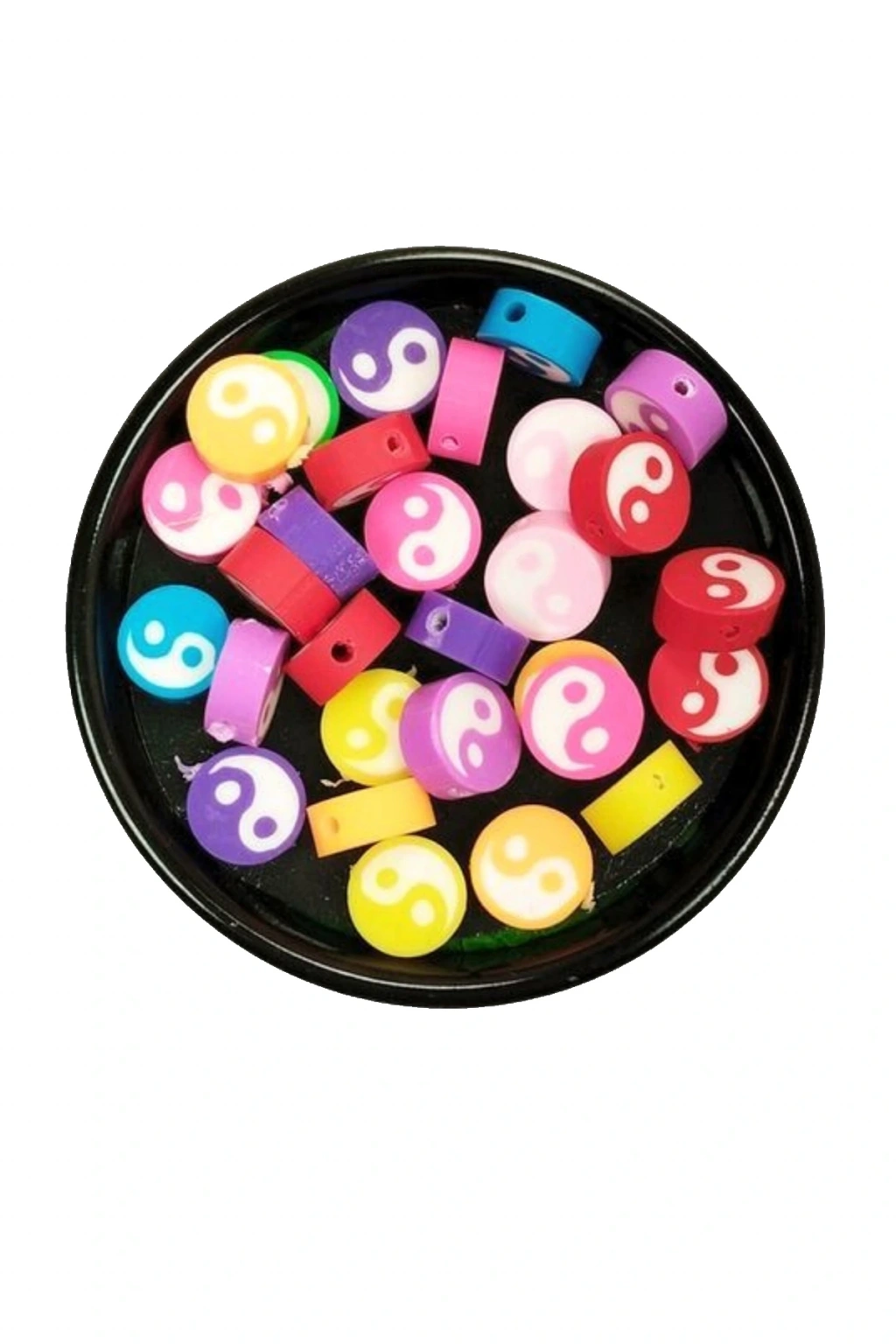 | 30 Adet 10 mm Polimer Kil Fimo Boncuk Takı Bileklik + 1 Metre Lastikli Misina Hediye - Renkli Yin Yang |