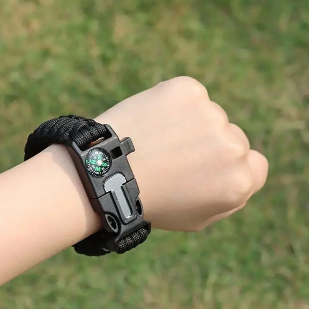 BUFFER® 5'i 1 Arada Çok Fonksiyonlu Hayatta Kalma Bilekliği, doğa aktivitelerinde güvenliği yanınızda taşımak için mükemmel bir çözümdür. Kamp, doğa yürüyüşleri ve acil durumlar için işlevsel ve pratik özellikleriyle yanınızda bulundurabileceğiniz çok yönlü bir yardımcıdır. Şık tasarımı sayesinde günlük yaşamda bileğinizde taşımaya da uygundur.