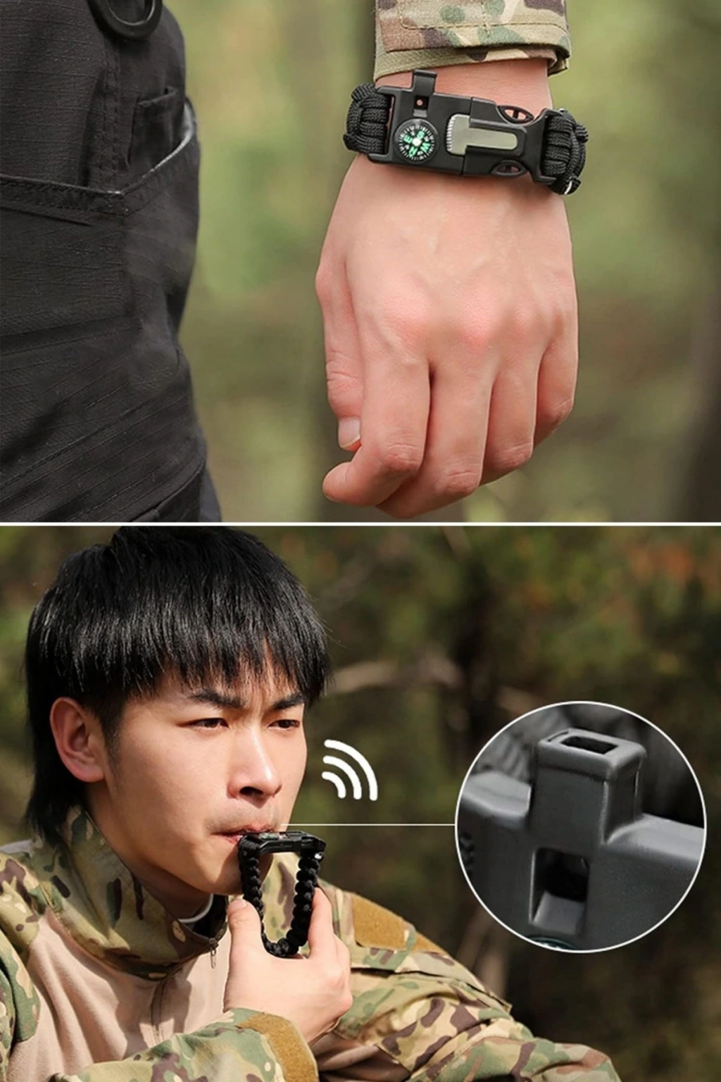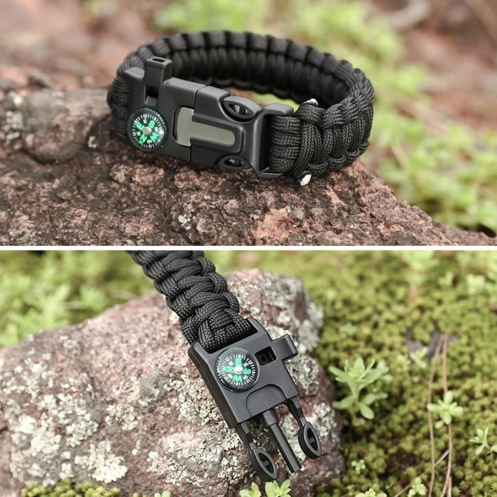 BUFFER® 5'i 1 Arada Çok Fonksiyonlu Hayatta Kalma Bilekliği Pusula, Düdük, Çakmak Taşı ve Şemsiye İpi Bileklik