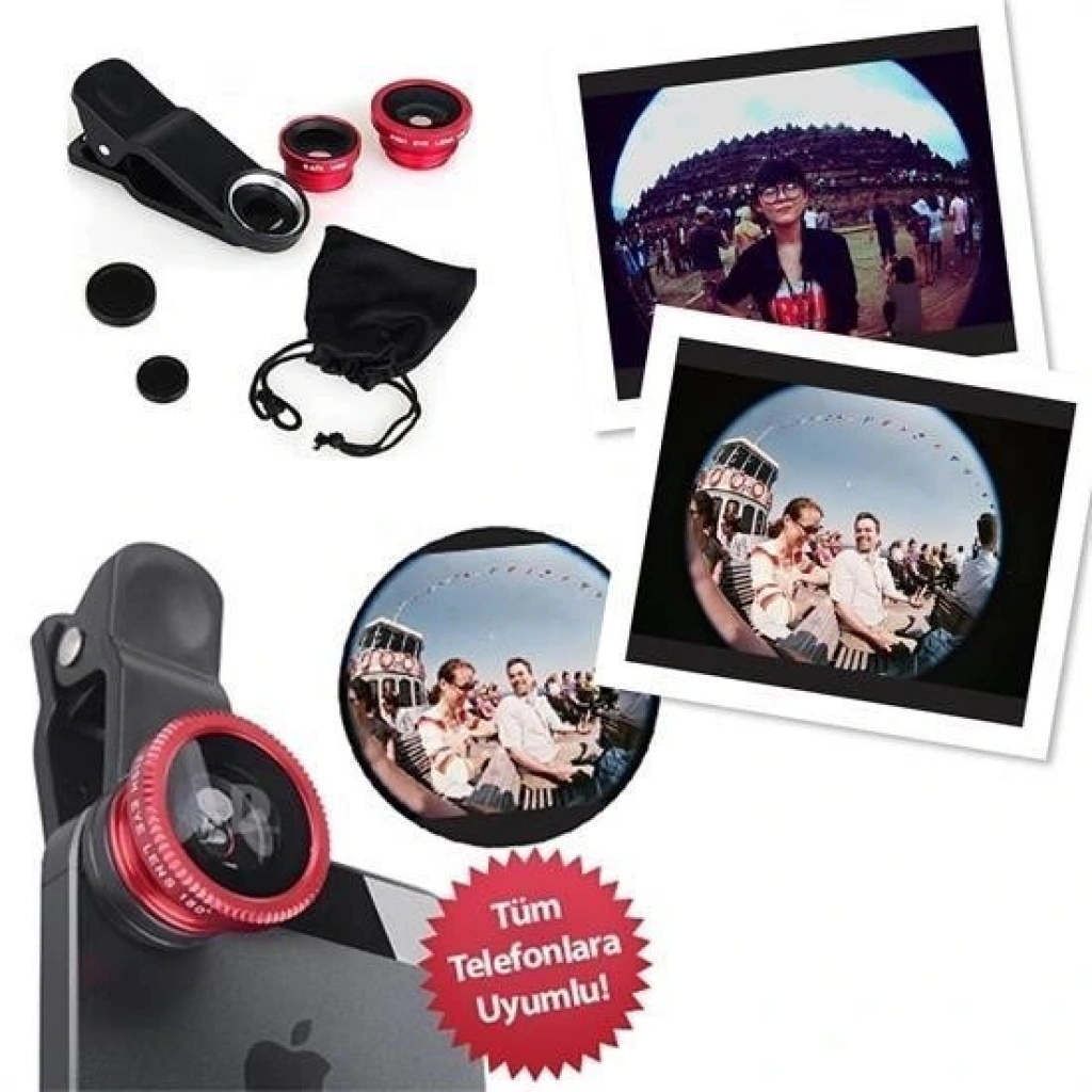 Son dönemde birçok sosyal paylaşım sitesinde arkadaşlarınızın paylaştığı fish eye görüş açısıyla çekilmiş fotoğrafları fark etmişsinizdir Peki ama nasıl bu görüş açısını yakalıyorlar? Tabi ki Universal Geniş Açılı Lens Fish Eye ile! Tüm akıllı telefonlar ile uyumlu lensler sayesinde, ister seyahat ettiğiniz yerlerde isterseniz de arkadaş grubunuz ile harika kareler yakalamak artık mümkün Paket içeriğindeki 3 adet lens ile farklı görüntüler yakalayabilir ve bu görüntüleri arkadaşlarınızla paylaşabilirsiniz Son derece kolay kullanıma sahip lensleri paket içeriğine dahil lens mandalı ile tüm akıllı telefonlarda kullanabilirsiniz Kullanım Talimatı: Lens mandalını telefonunuzun kamerasına denk gelecek şekilde yerleştirin Kullanmak istediğiniz lensi lens mandalına çevirerek takın Ürün Özellikleri: 2 adet farklı lens (fish eye- macro wide) Lens mandalı ile akıllı telefonlara uyumlu Kolay kullanım ve taşınabilme özelliği Paket İçeriği:   1 Adet Wide Lens 1 Adet Fish Eye Lens 1 Adet Micro Lens 1 Adet Lens Mandalı 1 Adet Lens Kılıfı   Not: Ürün Karışık Renklerde Gönderilecektir Micro ve Wide Lensler birbirine monte haldedirWide lens Micro lens ile beraber kullanılır Micro Lens kullanımı için lensleri çevirerek birbirinden ayırmanız gerekmektedir En:8 Boy:11 Derinlik:2