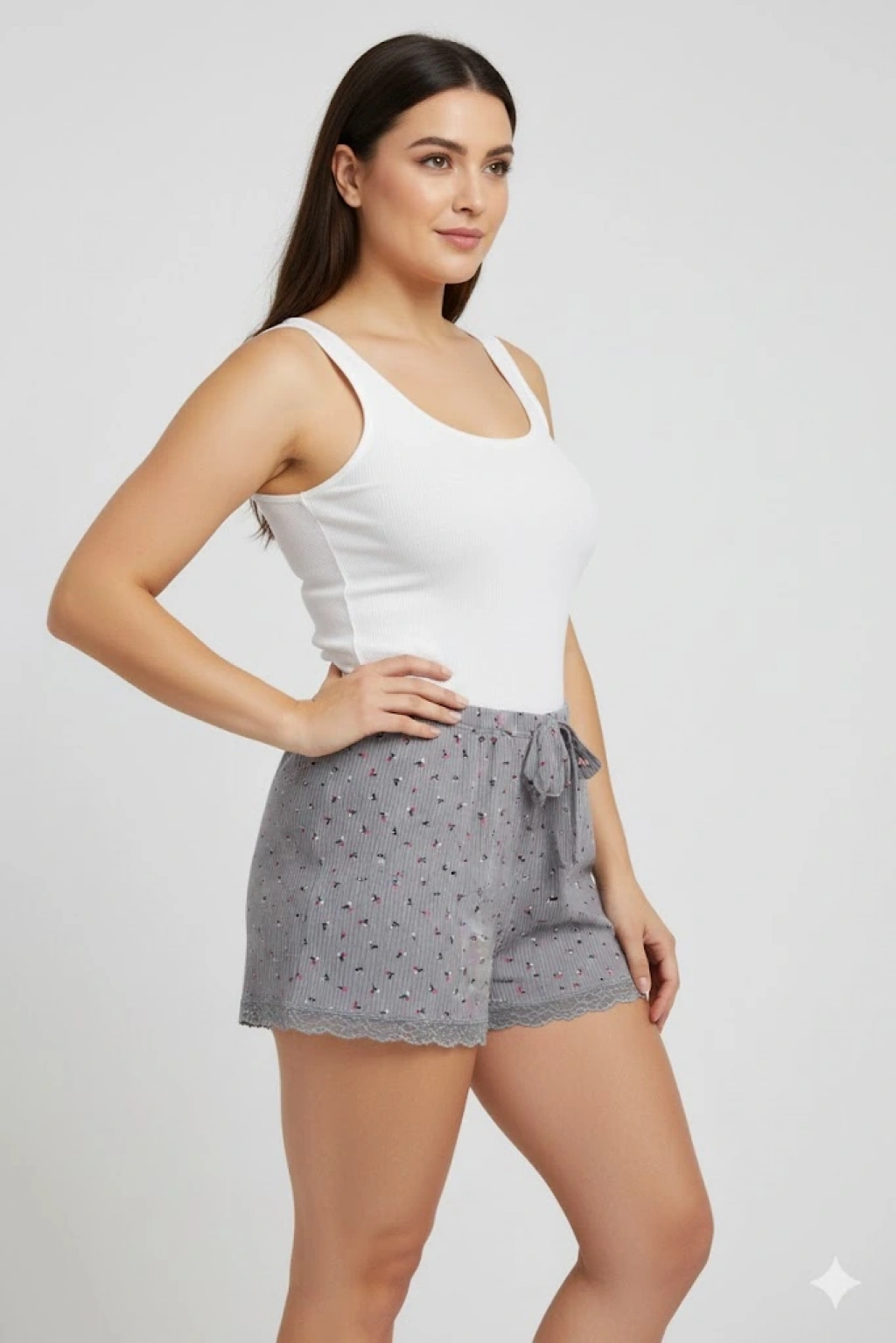 Düz Renk Mini Çiçek Desenli Penye Kadın Ev Şortu Bacak Dantel Detaylı Ev Giyim Gri