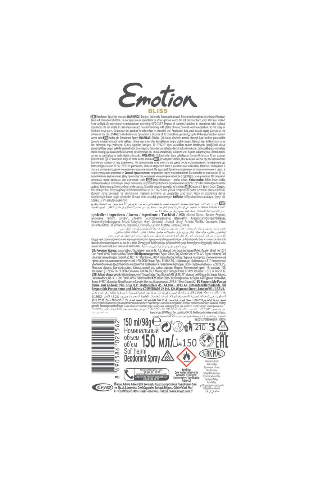 Emotion Bliss, özel tasarımlı sprey tüp ambalajı ile kutusuz olarak gönderilecektir. Ürün üzerinde marka ve içerik bilgileri yer almakta olup, doğrudan kullanıma hazır şekilde