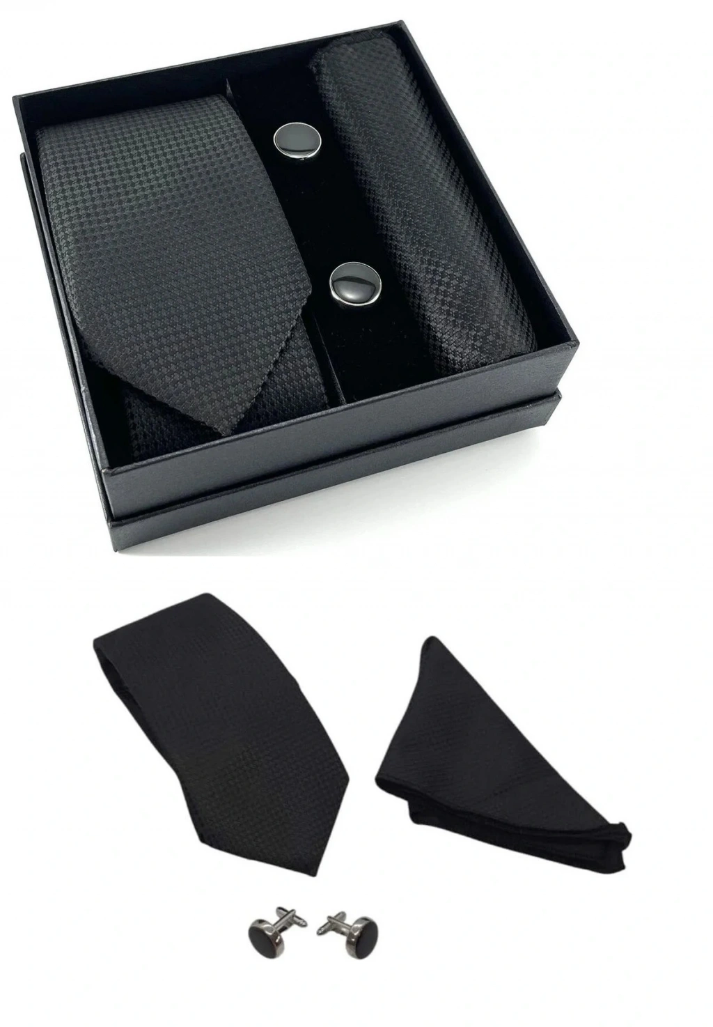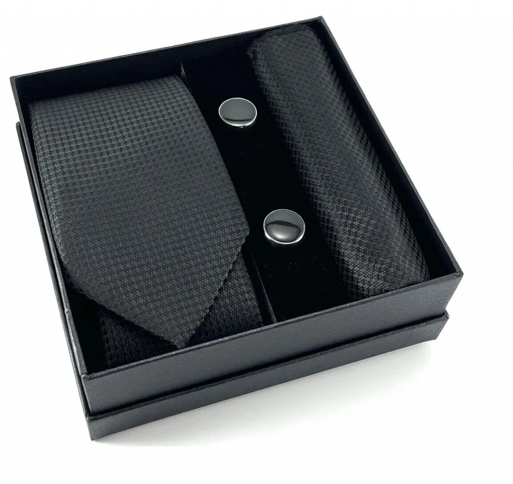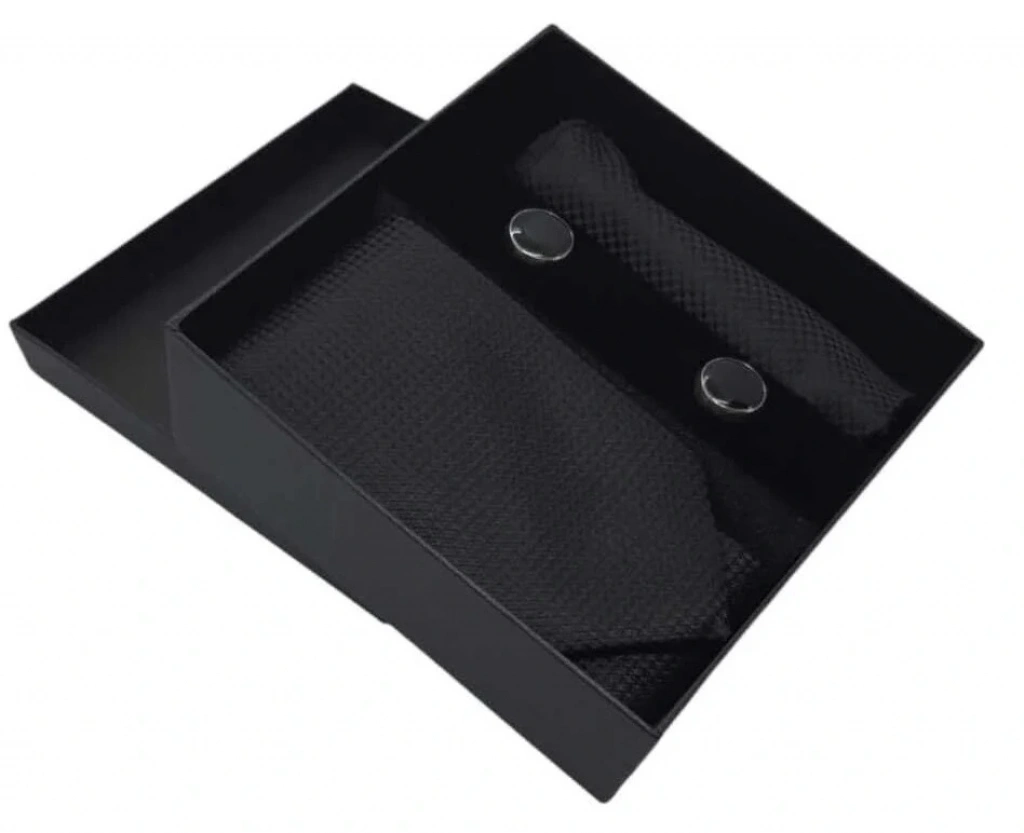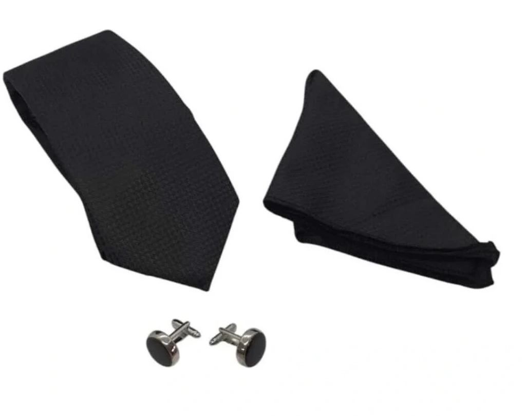 Kravat Düğme Set Siyah Desenli Kravat Mendil Kol Düğmesi Özel Set