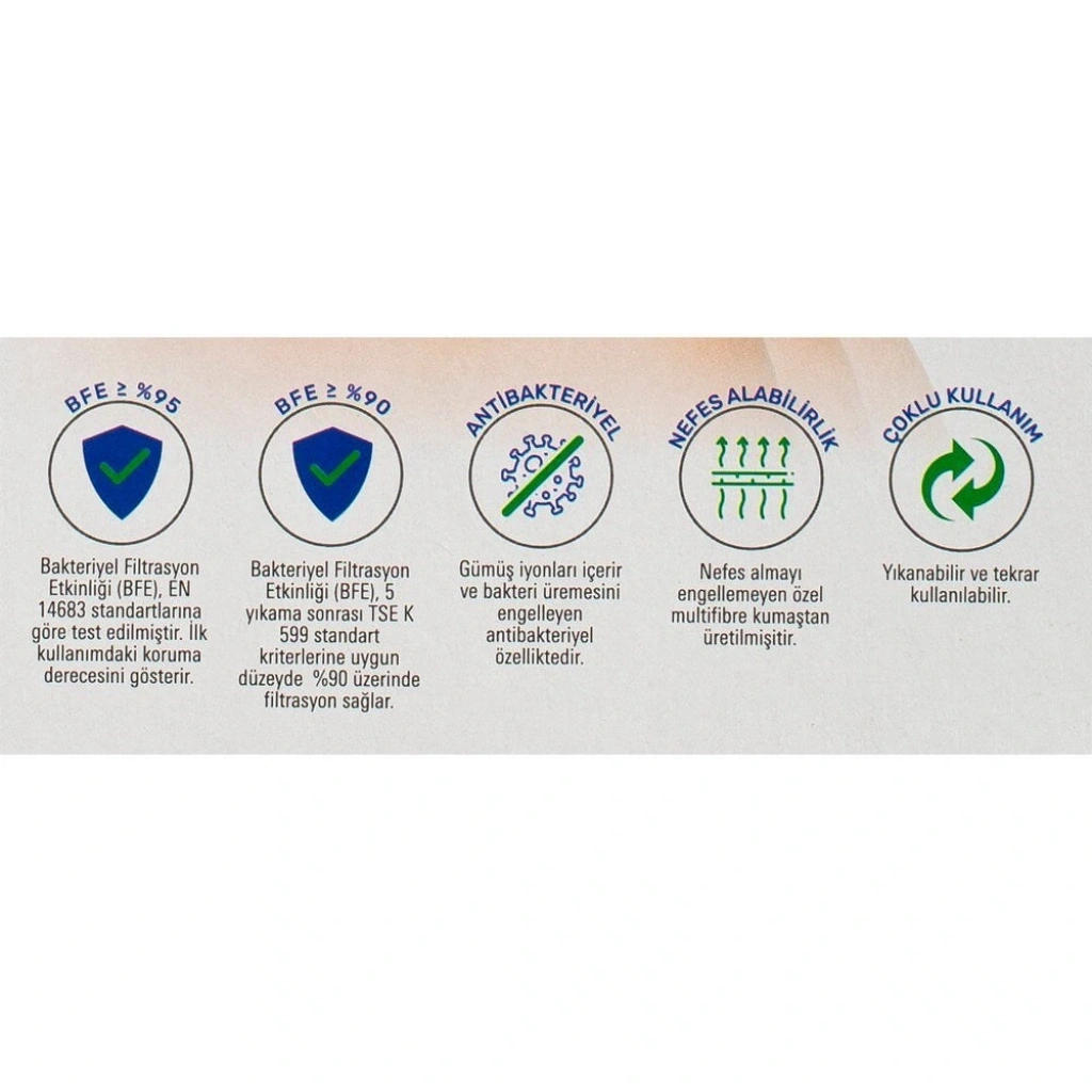 *Bakteriyel Filtrasyon Etkinliği (BFE),5 yıkama sonrası TSE K599 standart kriterlerine uygun düzeyde %90 üzerinde filtrasyon sağlamaktadır.