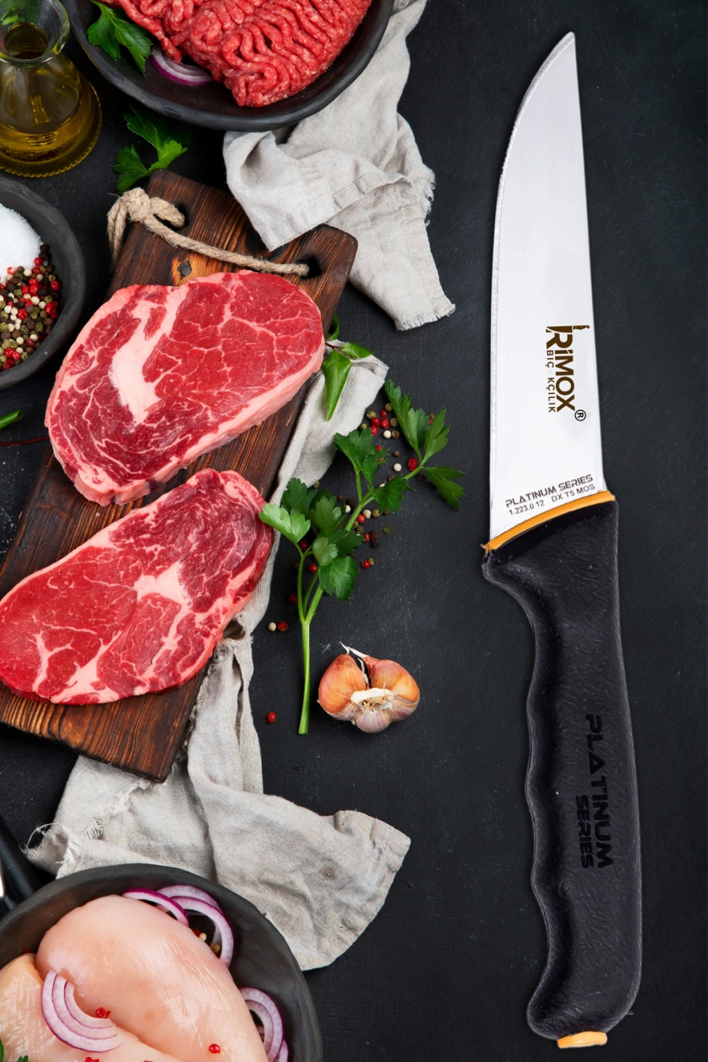 | Platinium Serisi Kasap ve Ev Mutfak Bıçağı Çelik Kasap No:0 Platinium Series Kasap No: 0 BIÇAK AĞIZ BOYU: 12 cm SAP BOY:13 cm -Platinium Bıçaklarımız T5 Fransız/Alman Çubuk Çeliğinden üretildi. Kauçuk ve Termo plastik alaşımlı sapı sayesinde |